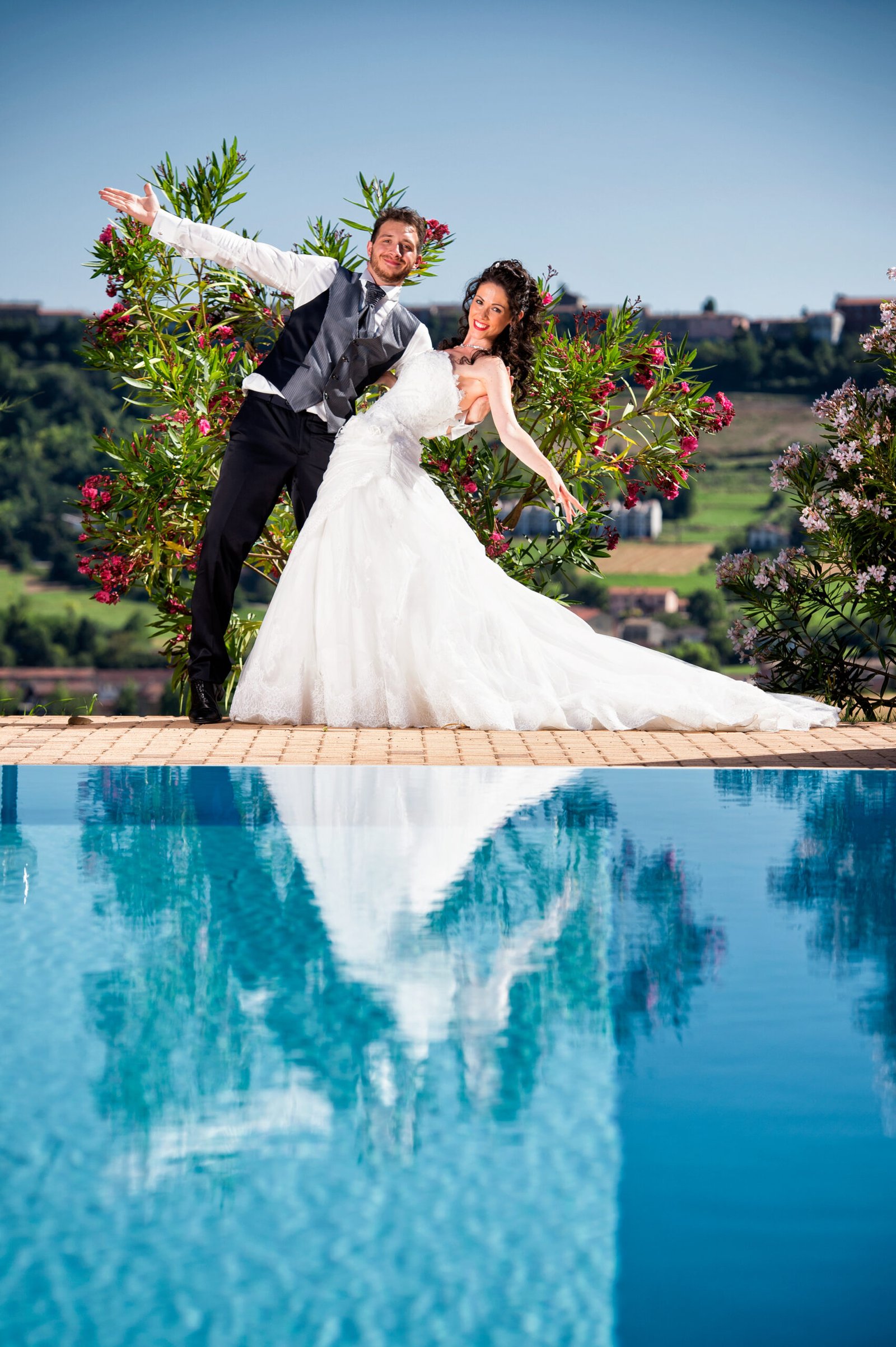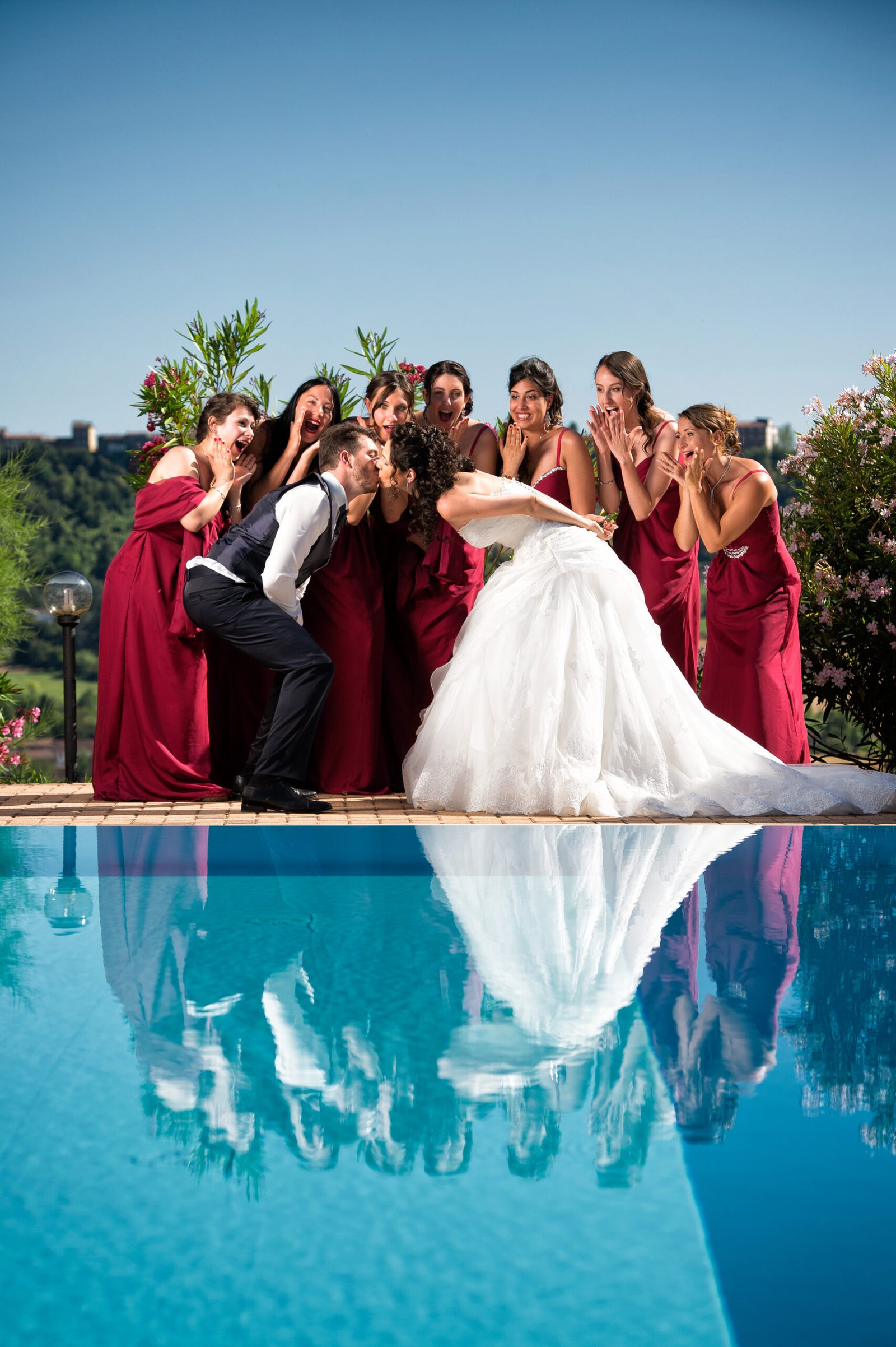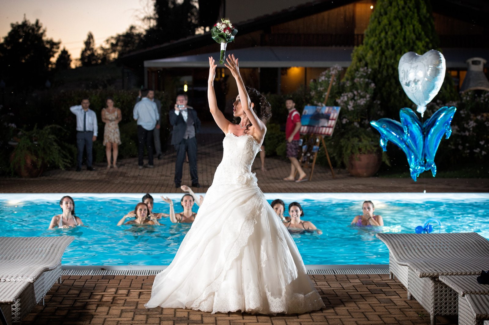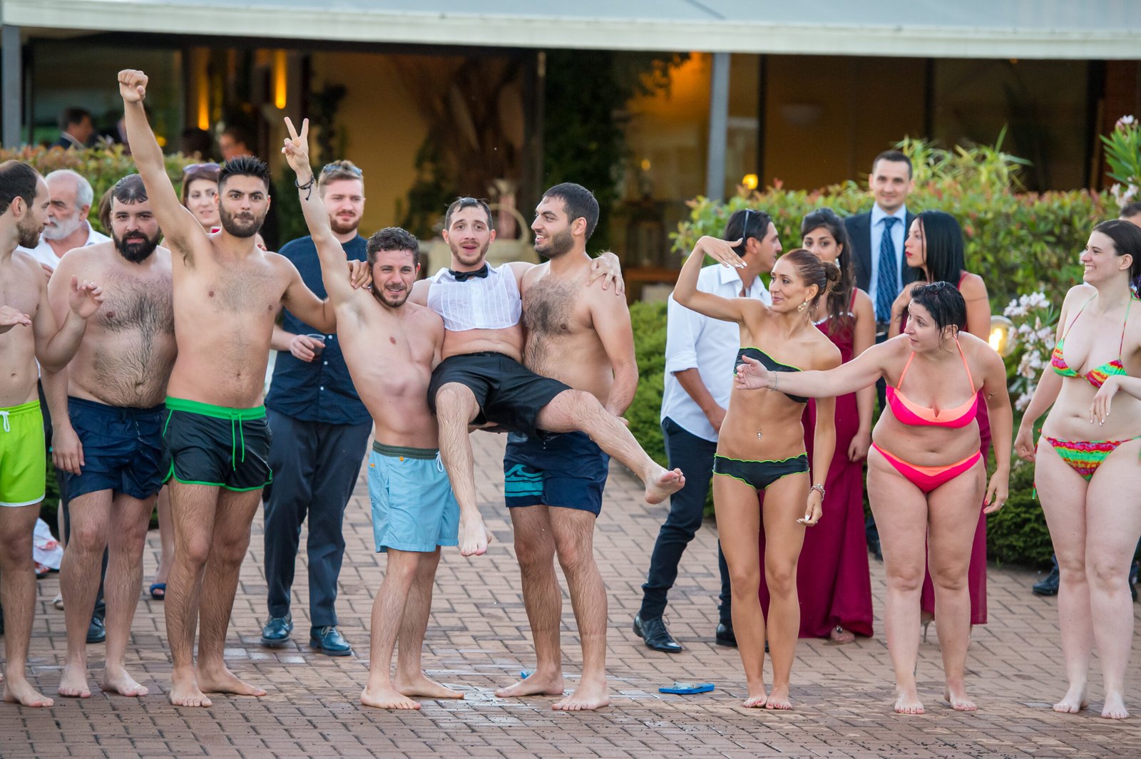 Gli amici non aspettavano altro che buttare Fabiano in piscina, e infatti ci sono riusciti; anche altri invitati si sono tuffati, soprattutto le ragazze single che volevano prendere il bouquet.