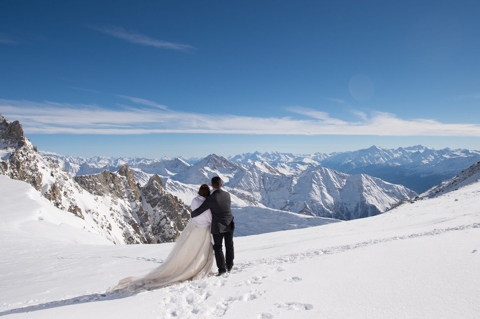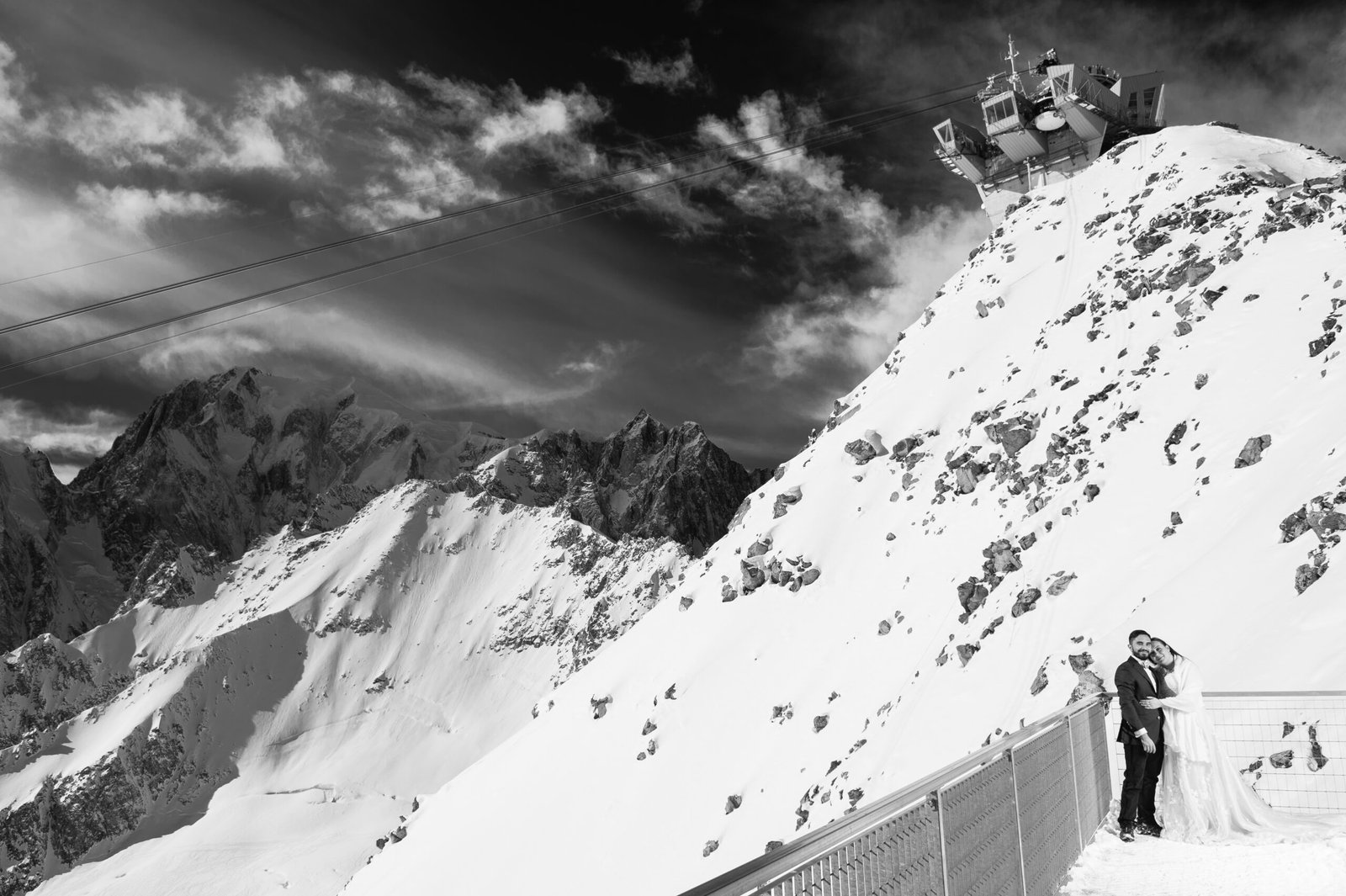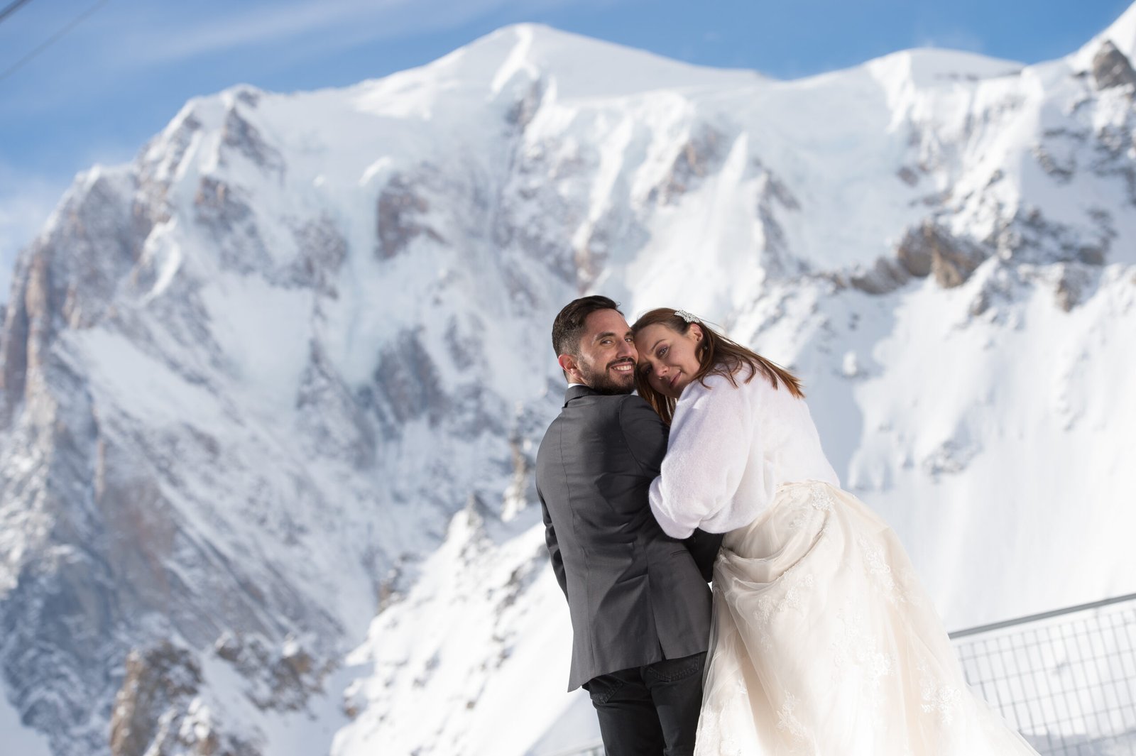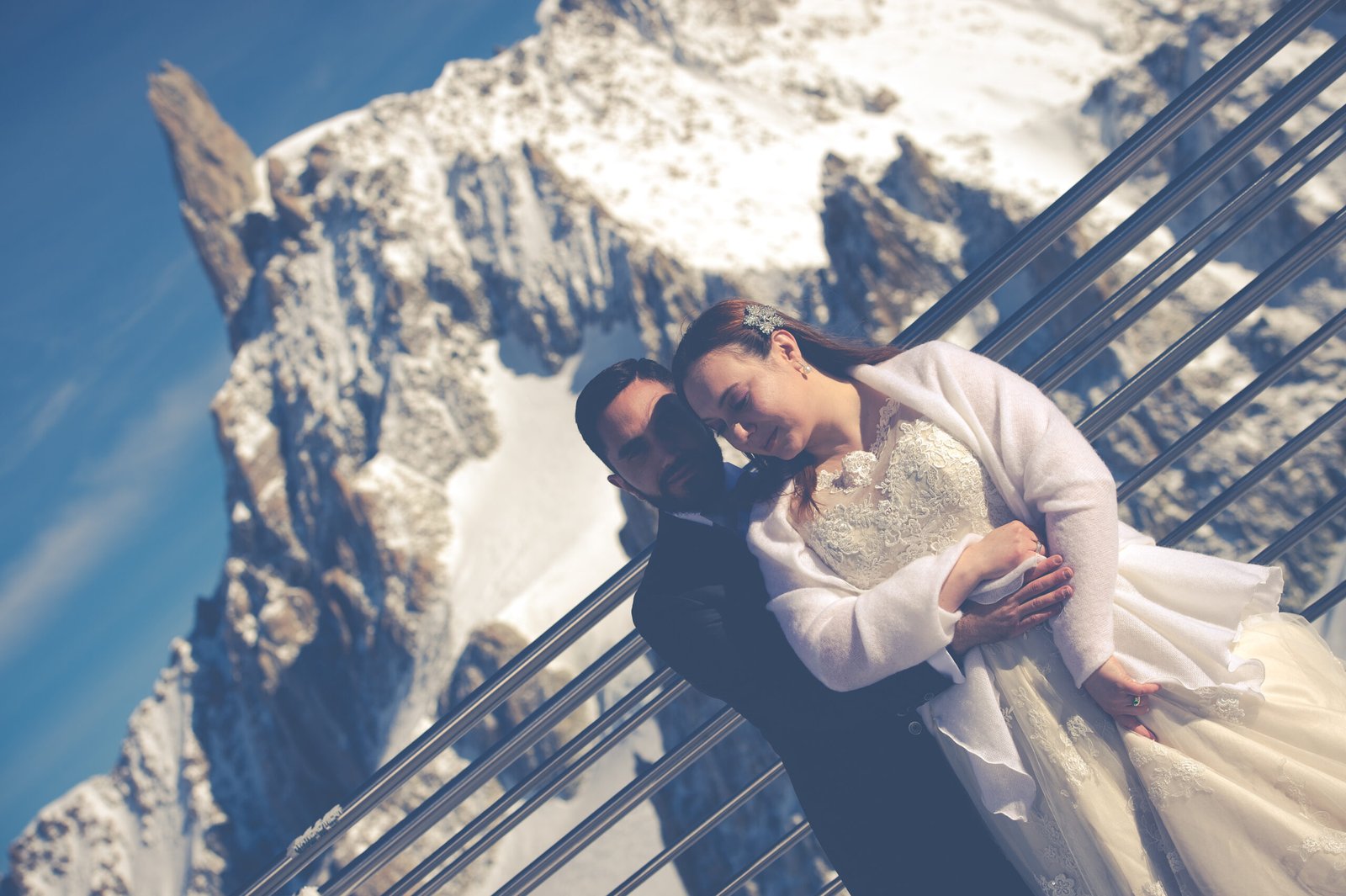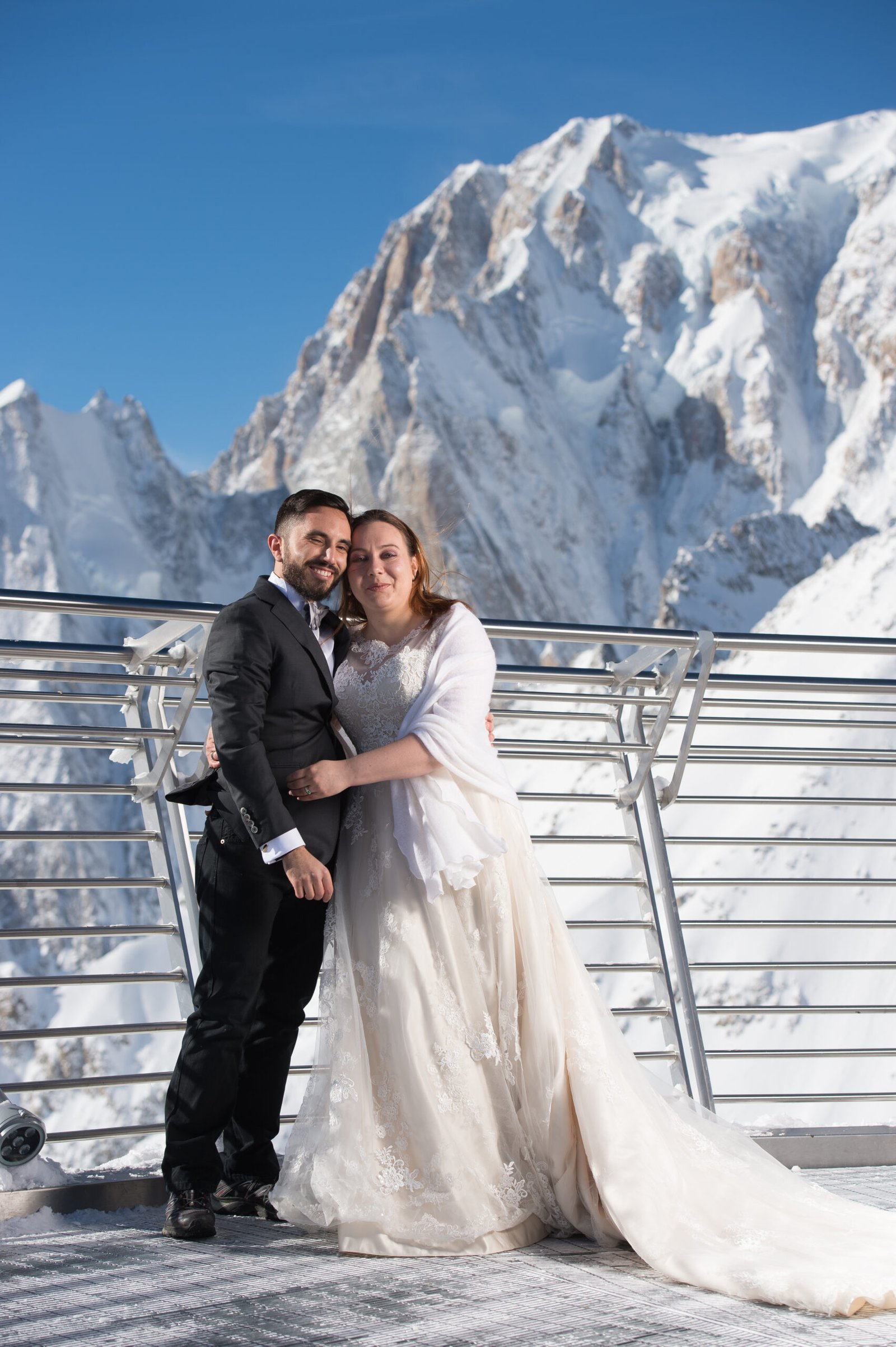 Dopo il loro viaggio di nozze, abbiamo deciso insieme di fare una sessione fotografica in montagna andando a Courmayeur sullo skyway del Monte Bianco, a 3466 metri d’altezza, scattando foto singolari che rispecchiano la loro grande passione.